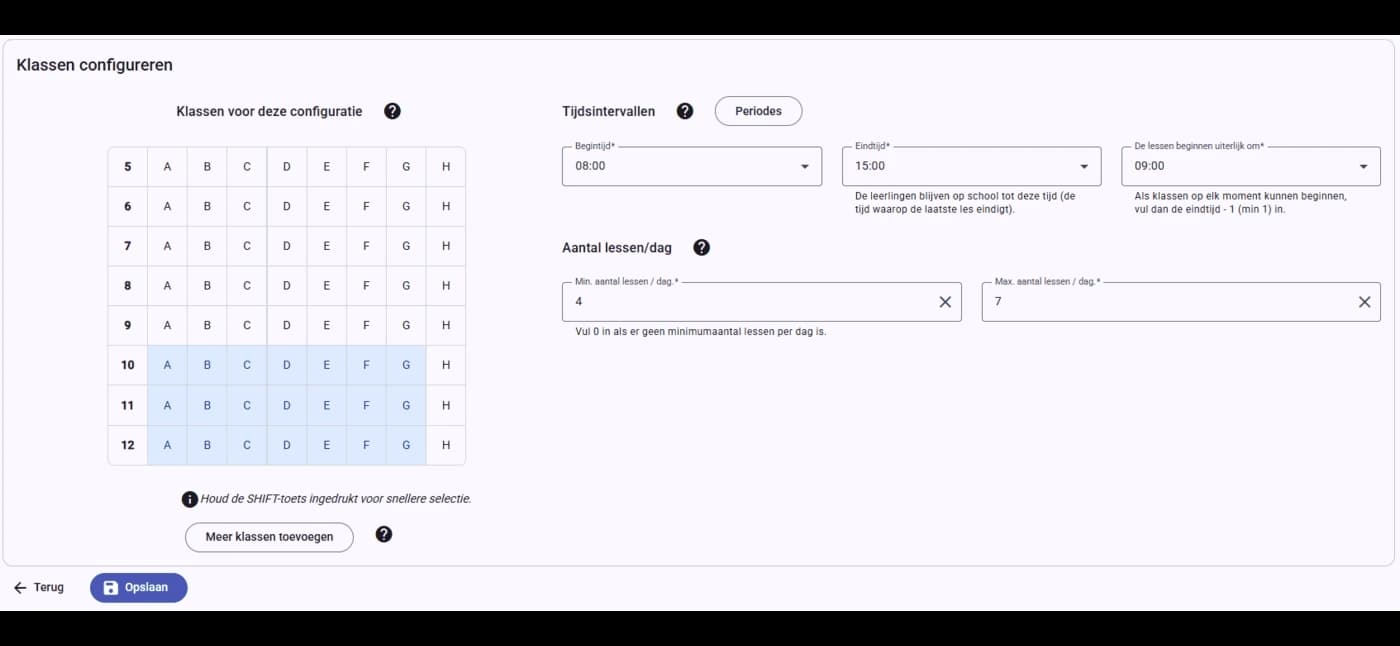 De duur van het genereren van een rooster varieert afhankelijk van de complexiteit van de gegevens. Voor eenvoudige schoolopstellingen duurt het meestal ongeveer 1 minuut, terwijl complexere scholen tot 10 minuten kunnen duren. U heeft de mogelijkheid om de generatietijd aan te passen, en over het algemeen kan meer tijd resulteren in een meer geoptimaliseerd en nauwkeurig rooster.