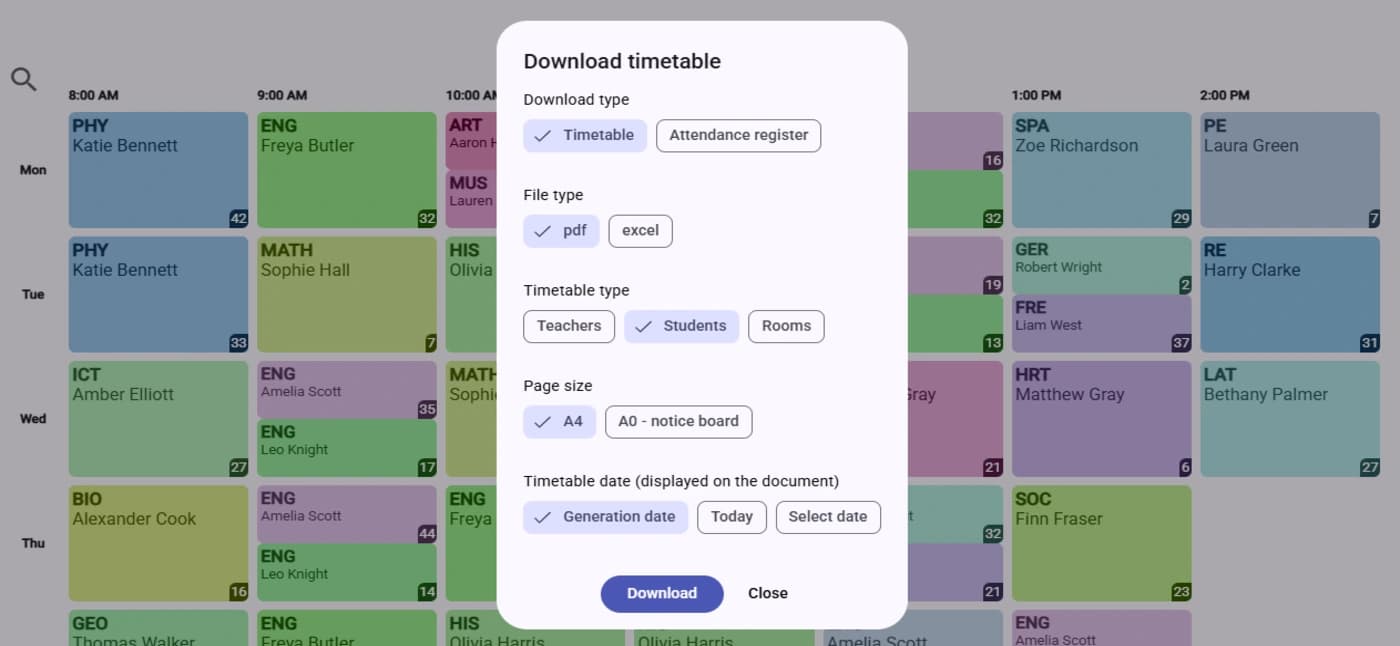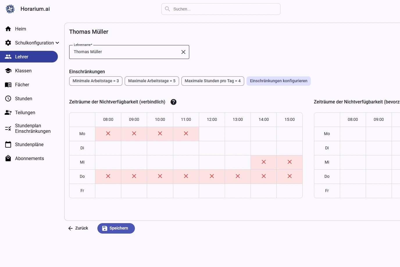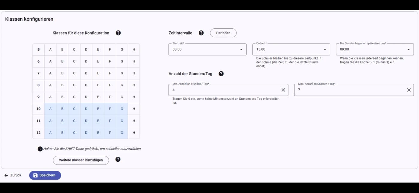 Sie können die Daten ganz einfach über die intuitive Benutzeroberfläche eingeben oder eine Excel-Datei verwenden, um die Schuldaten zu importieren. Anschließend wählen und konfigurieren Sie aus über 40 verfügbaren Einschränkungsarten – für Lehrkräfte, Schüler, Klassenräume oder Gebäude.
