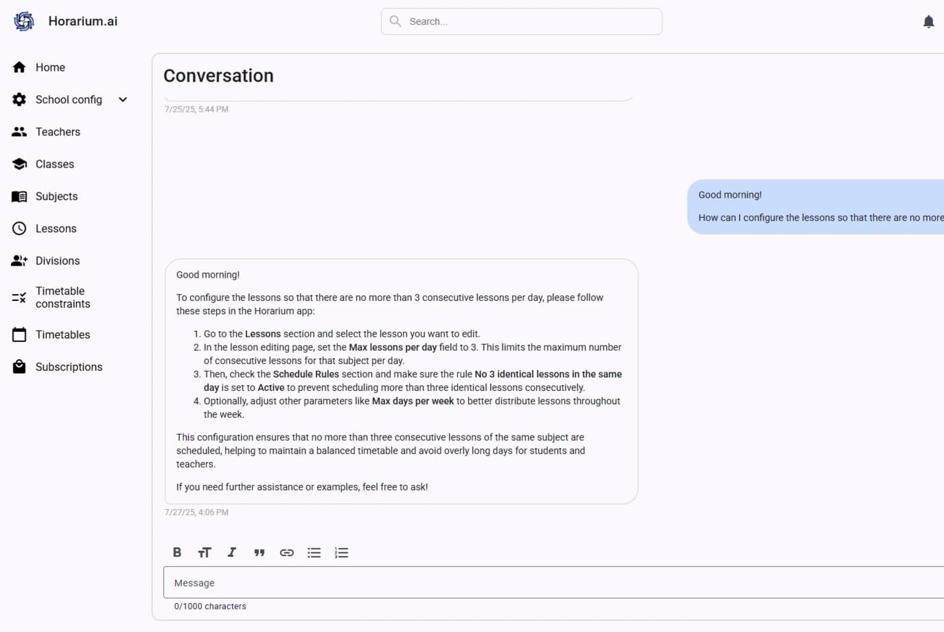 - Ich habe Horarium.ai zufällig entdeckt, da ich mit der Planungsplattform, die ich bis dahin benutzte, nicht vollständig zufrieden war. Auf Horarium.ai fand ich viele wirklich nützliche Funktionen, sowie eine intuitive Schnittstelle und ein erstklassiges Team.Vorteile